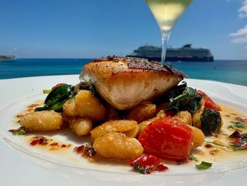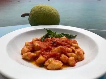 Local Breadfruit dumplings with Shrimp, Lobster and local calalloo in a mild spiced butter sauce.