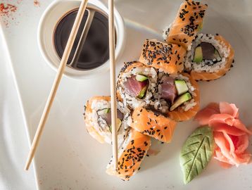 Tuna and Atlantic Salmon sushi roll served with Seaweed salad