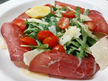 Thinly sliced beef with arugula salad, shaved parmesan, olive oil and a lemon dressing.