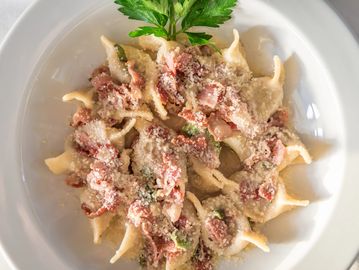 Traditional dish from Bergamo. Housemade Beef Ravioli Sauteed with Guanciale, Sage butter and Parmesan Cheese.