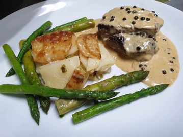 sautéed Asparagus and Green Peppercorn demi cream sauce.