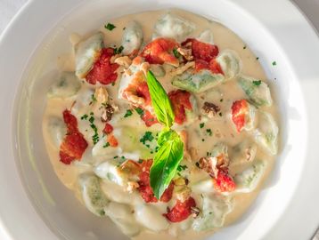 Homemade Potato dumplings served with creamy Gorgonzola, Tomato sauce & Walnuts