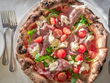 Tomato sauce, Parma Ham, Arugula, cherry Tomatoes, Mozzarella and shaved Parmesan.