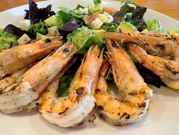 Grilled Head on Prawns with a citrus Butter sauce and choice of sides.