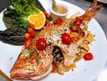 This local Classic is oven baked Whole Red Snapper served with